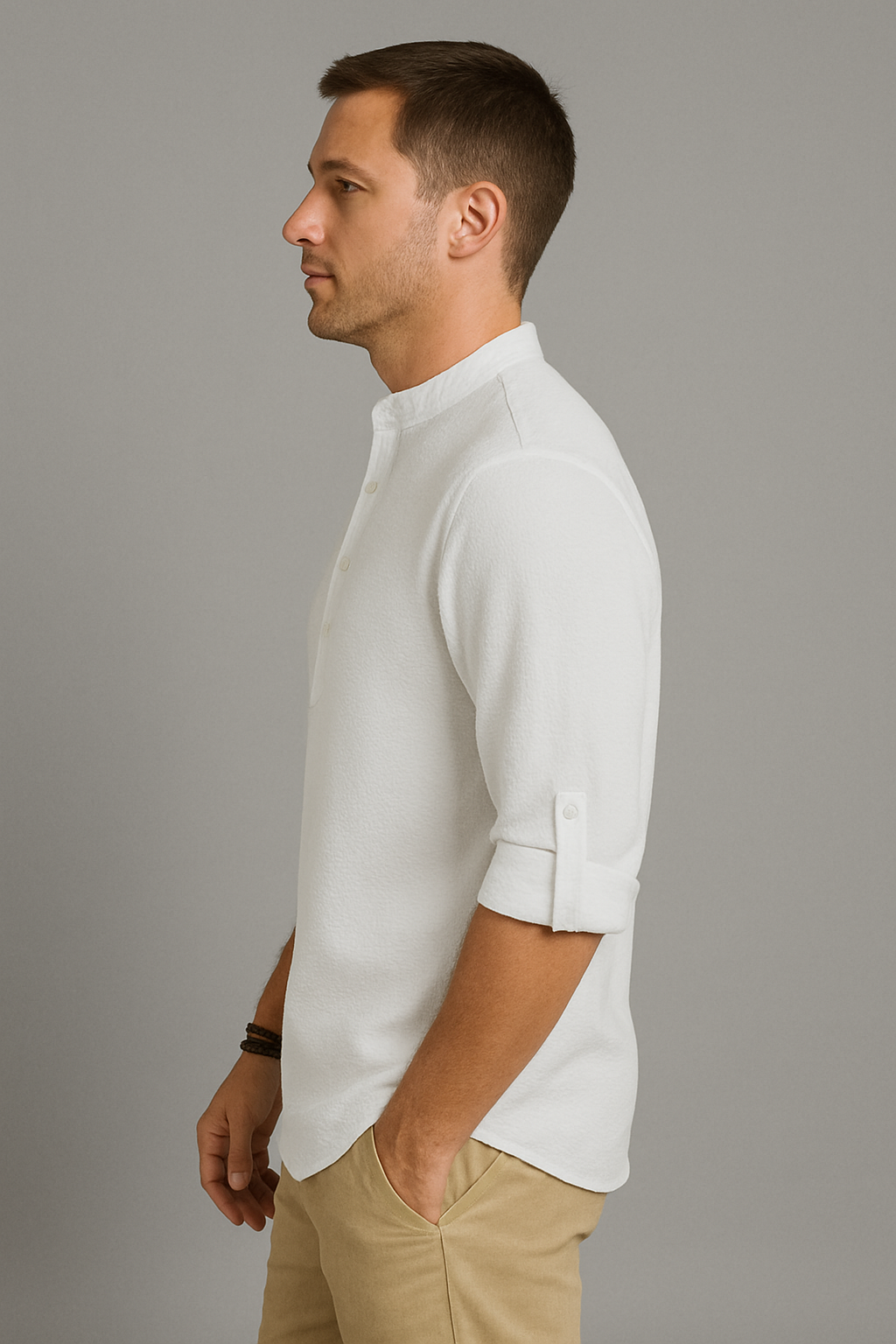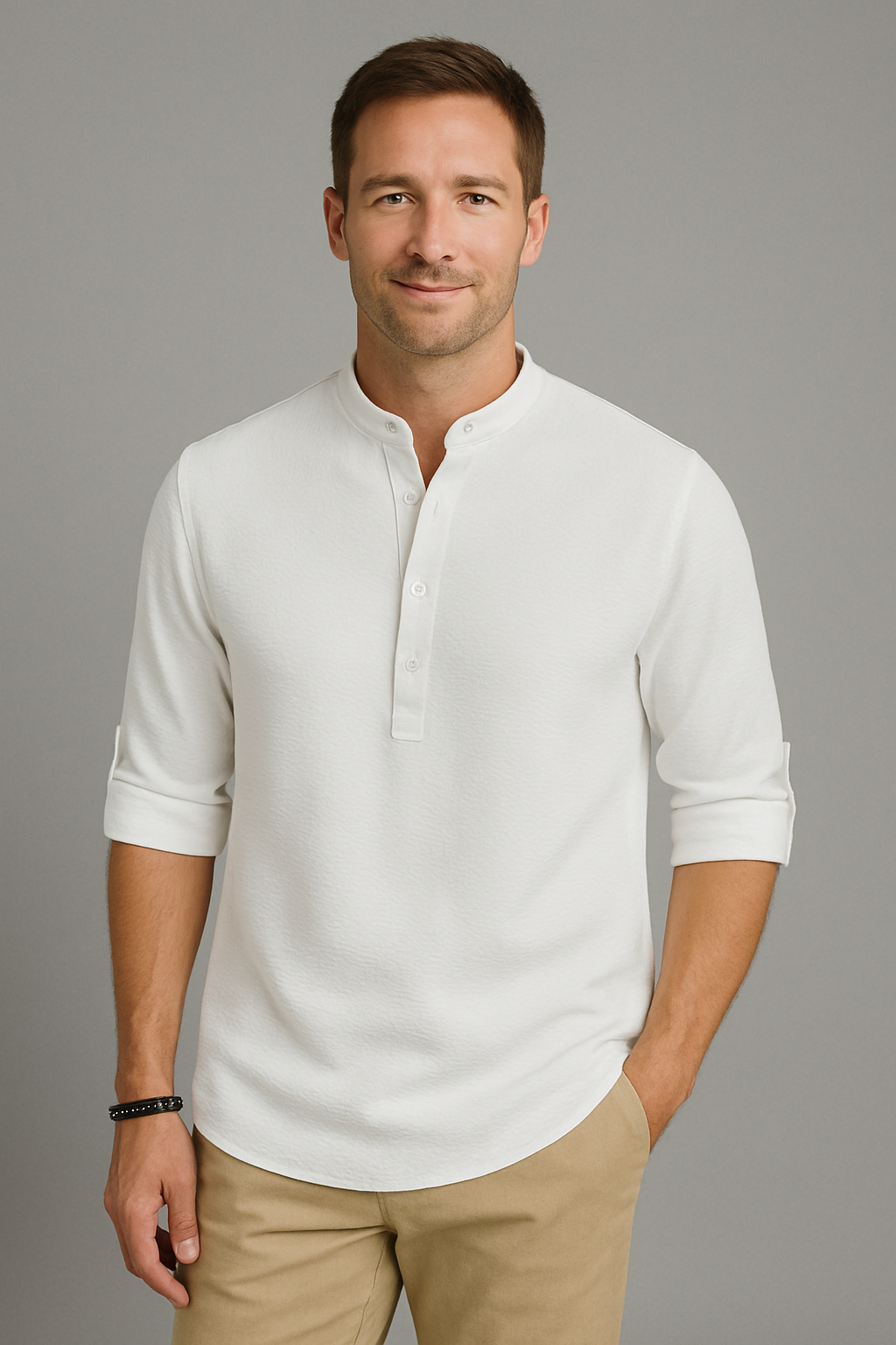 This summer long sleeve breathable men’s shirt redefines casual with a refined twist. The stand-up collar and half-button placket give it a structured, modern silhouette that instantly sharpens your look. Its classic plaid pattern adds character without overwhelming, making it an easy go-to for daily wear or laid-back weekends. Crafted for comfort and everyday versatility, it’s designed for men who want to look put-together without trying too hard. Pair it with dark jeans or tapered chinos and sneakers to complete a smart casual outfit.